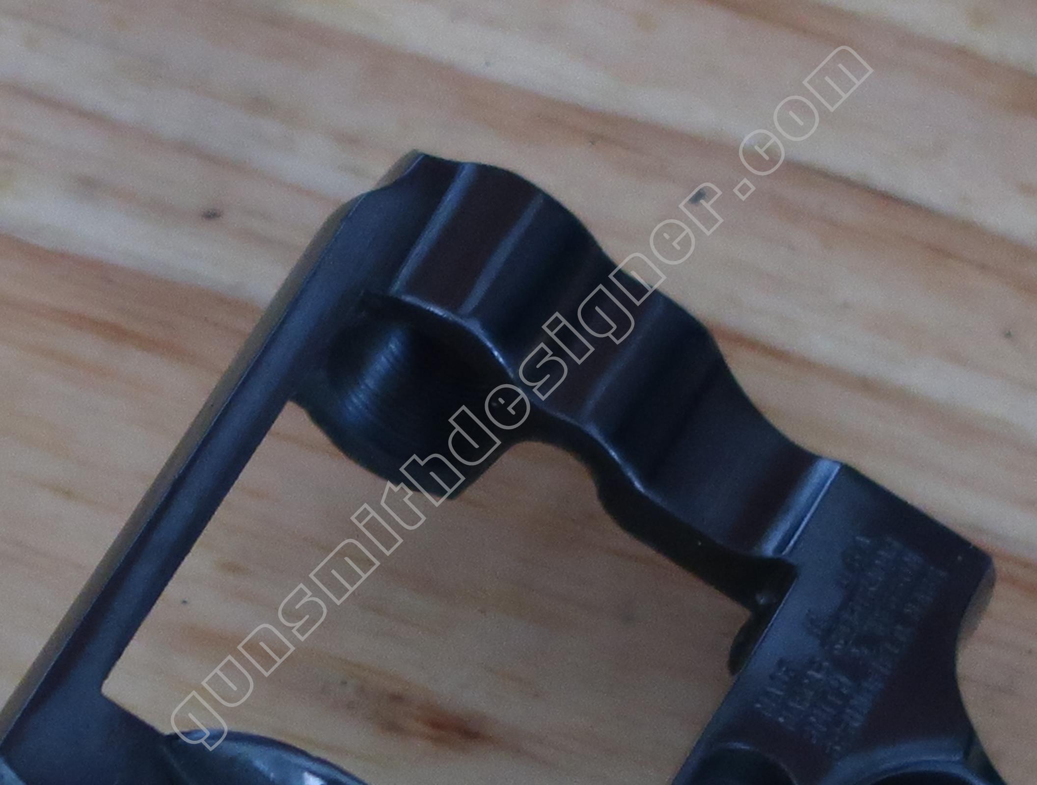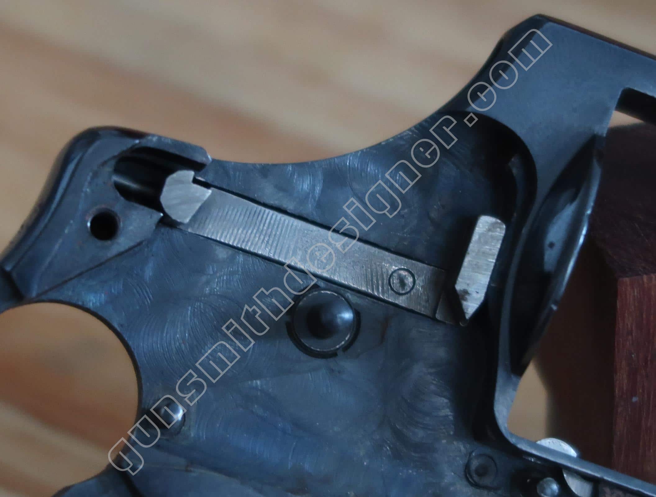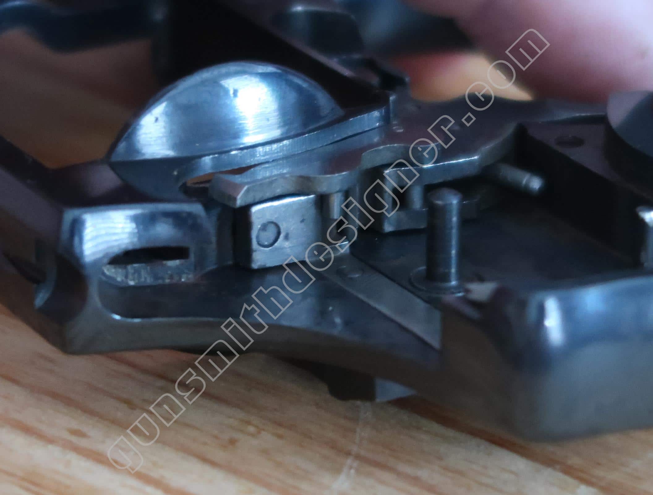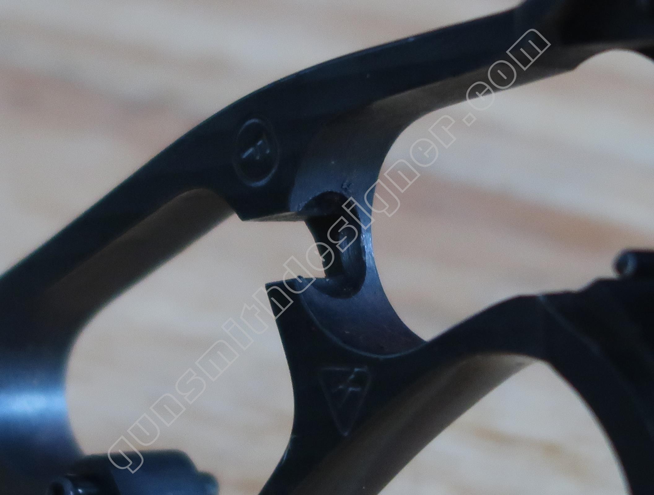 Sur la face interne, une rainure existe pour la sécurité du percuteur, une seconde pour l’élévateur de barillet.