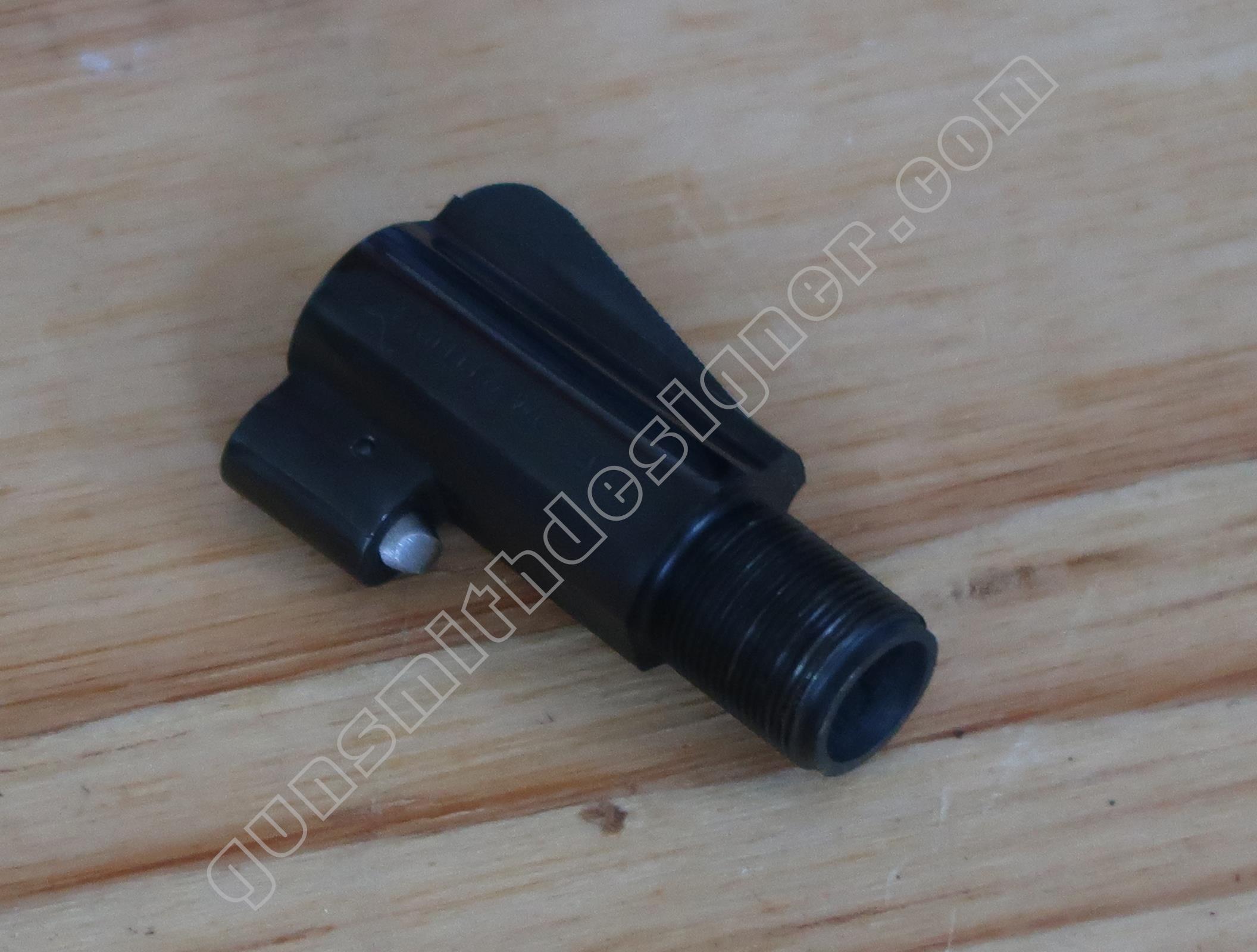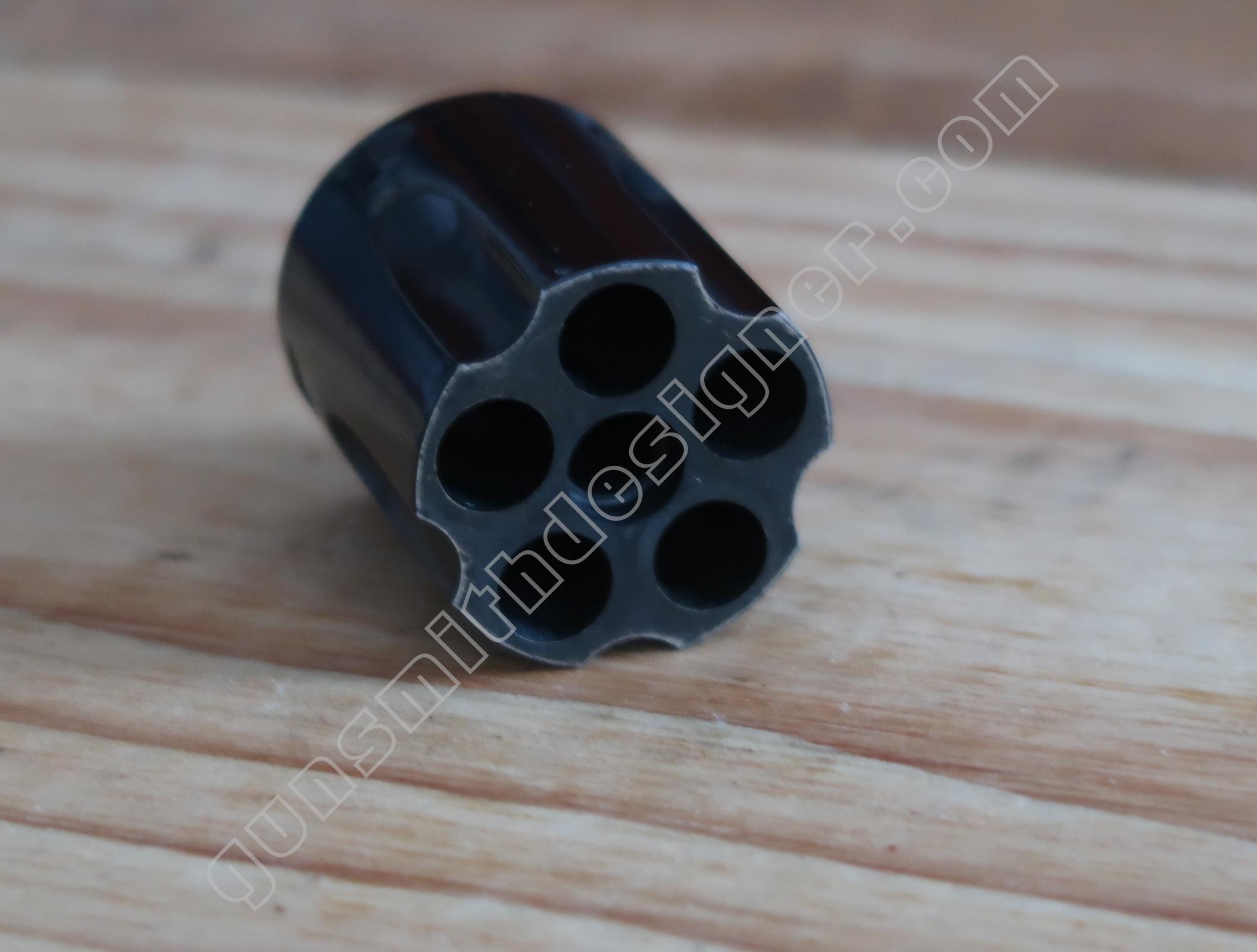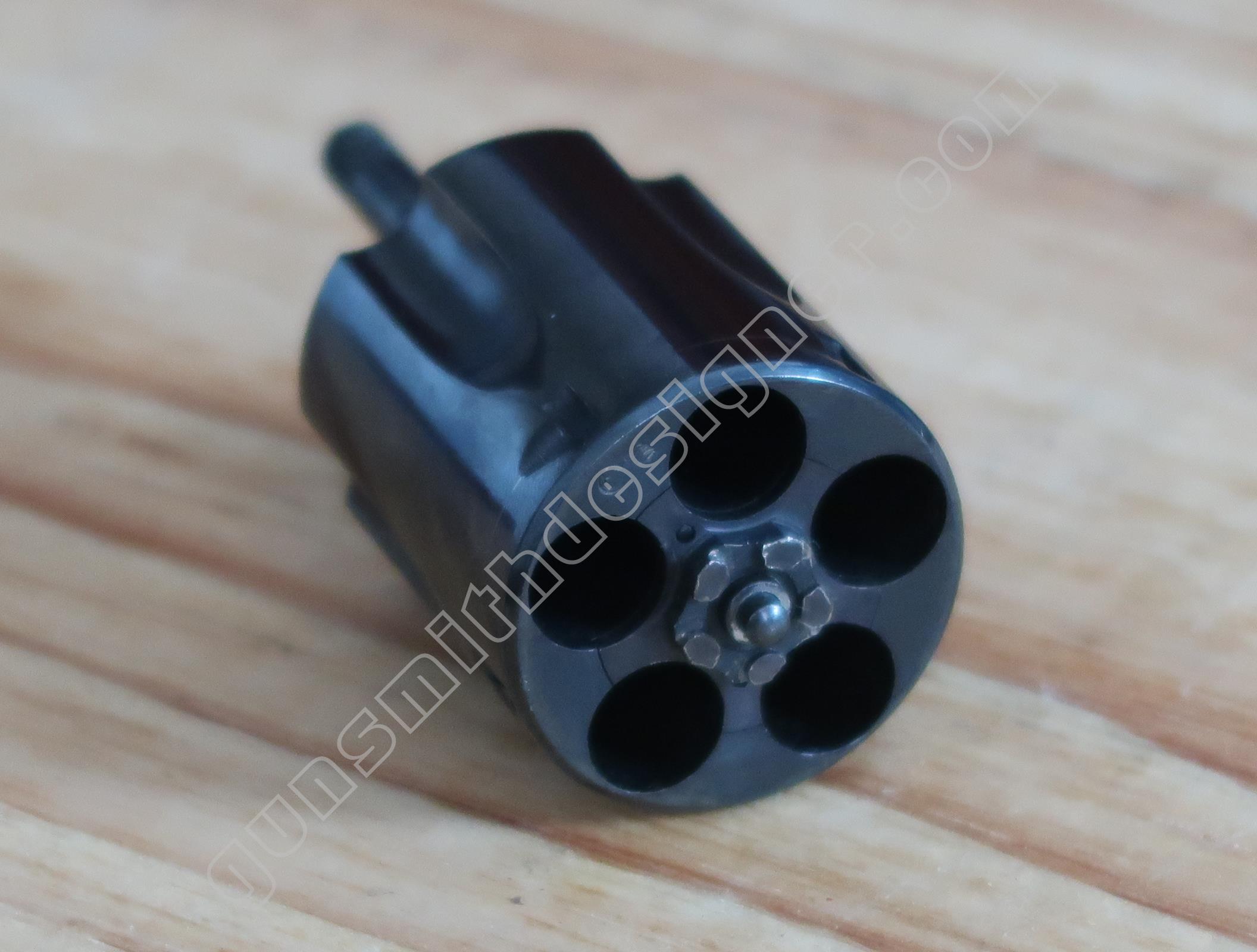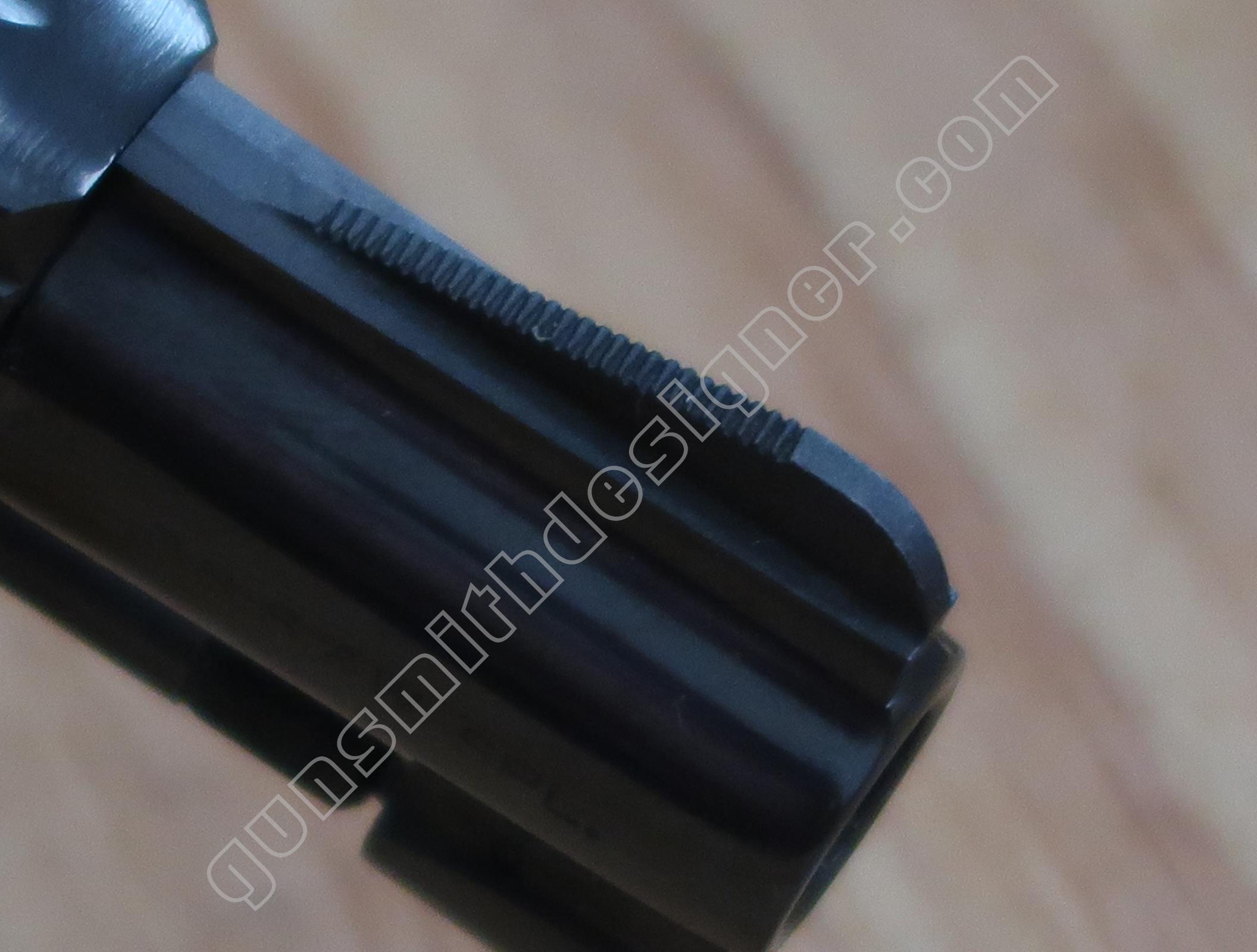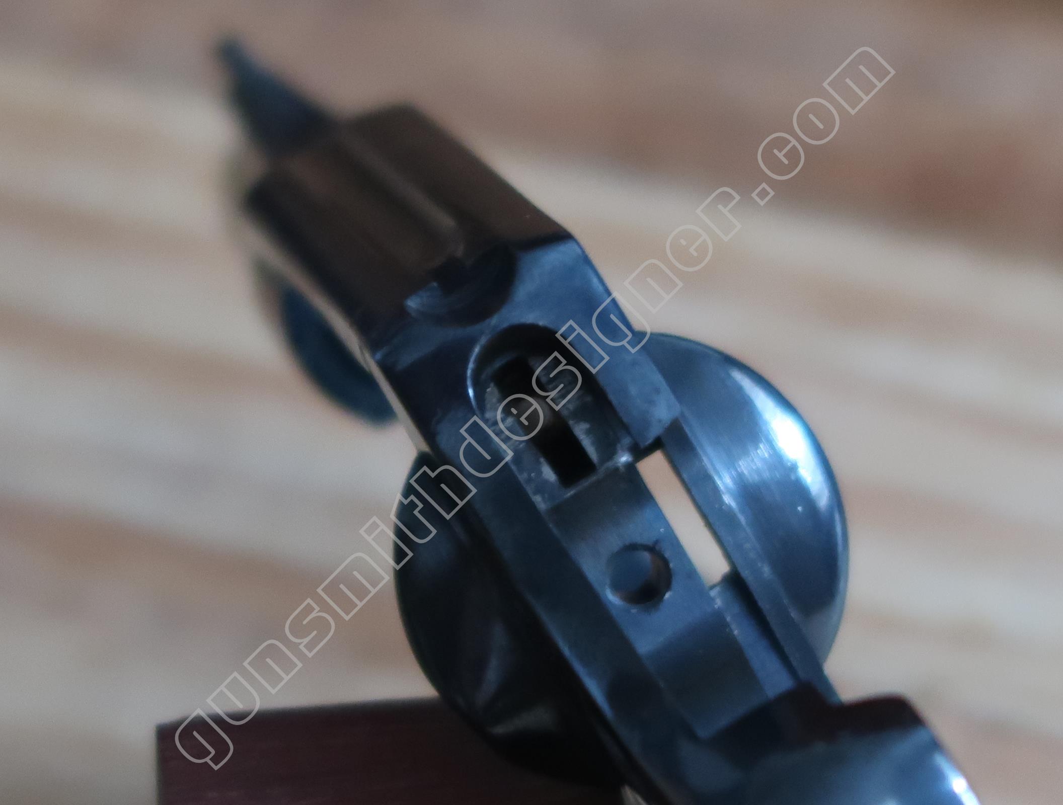 Le verrou avant de l’extension de l’étoile de barillet est monté sous le canon. C’est un petit cylindre étagé en acier qui coulisse d’avant en arrière dans son logement. Une goupille l’arrête. Un ressort de rappel hélicoïdal le maintient en position de saillie arrière.