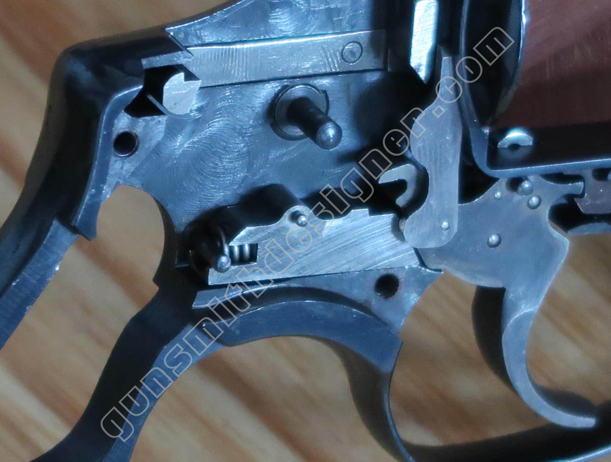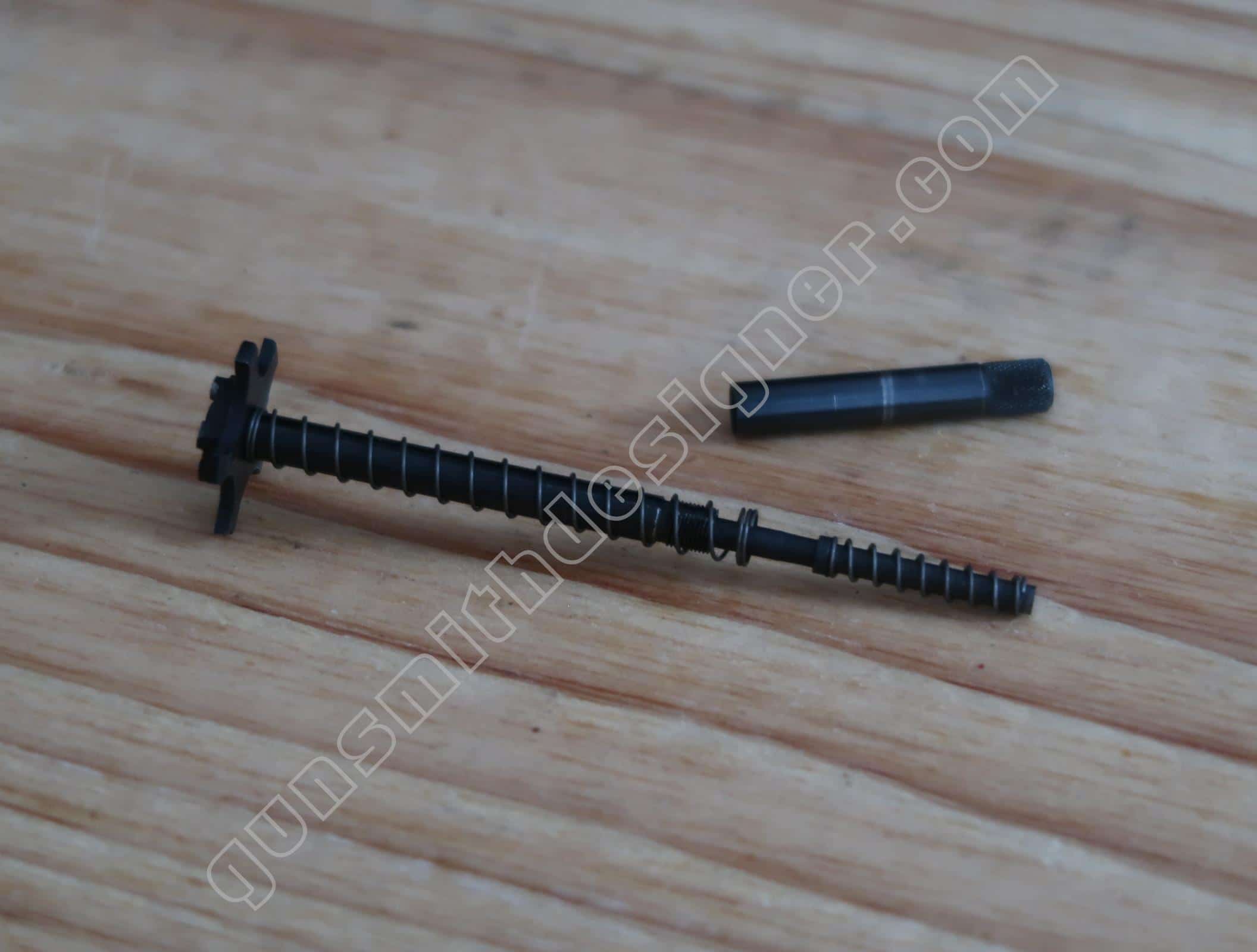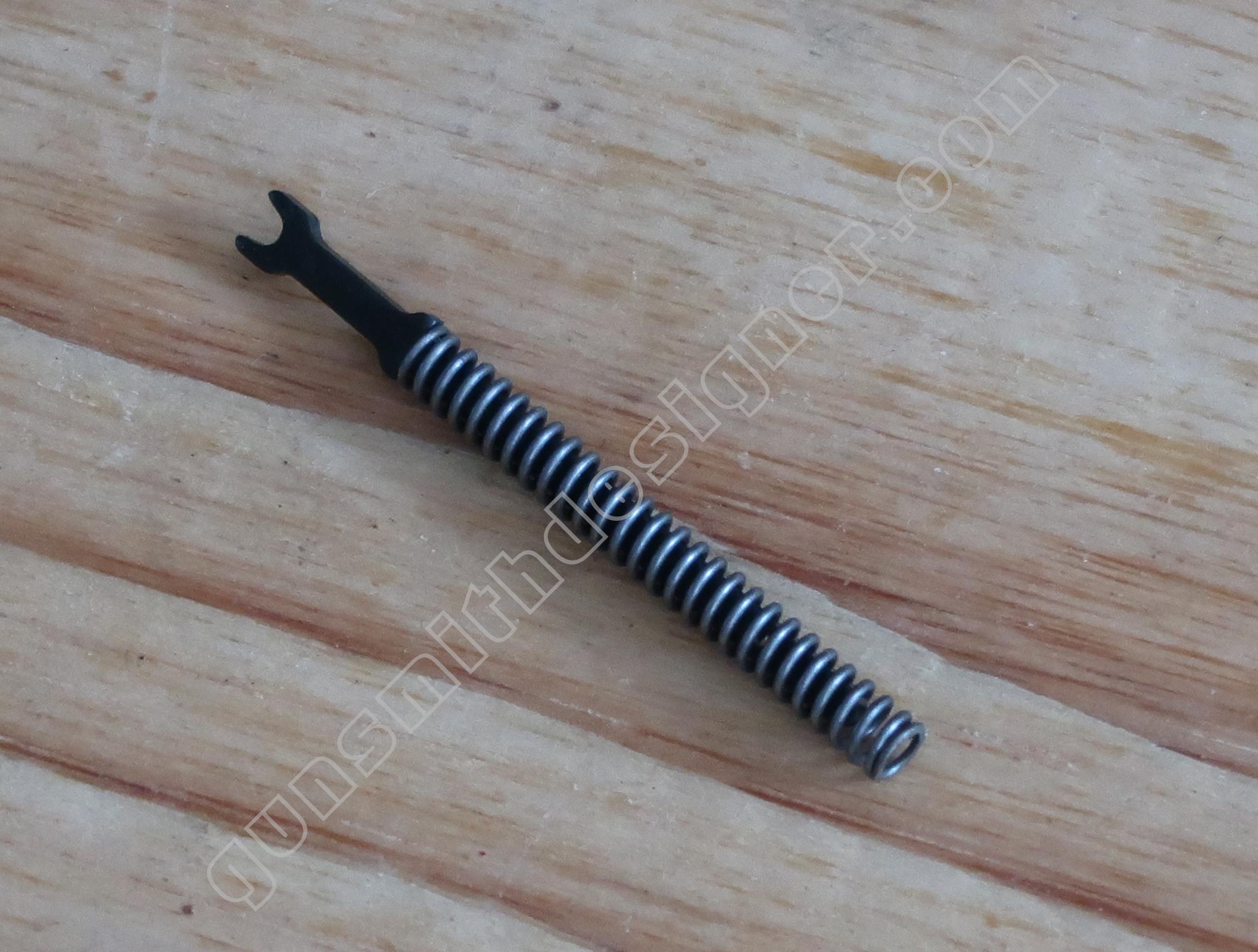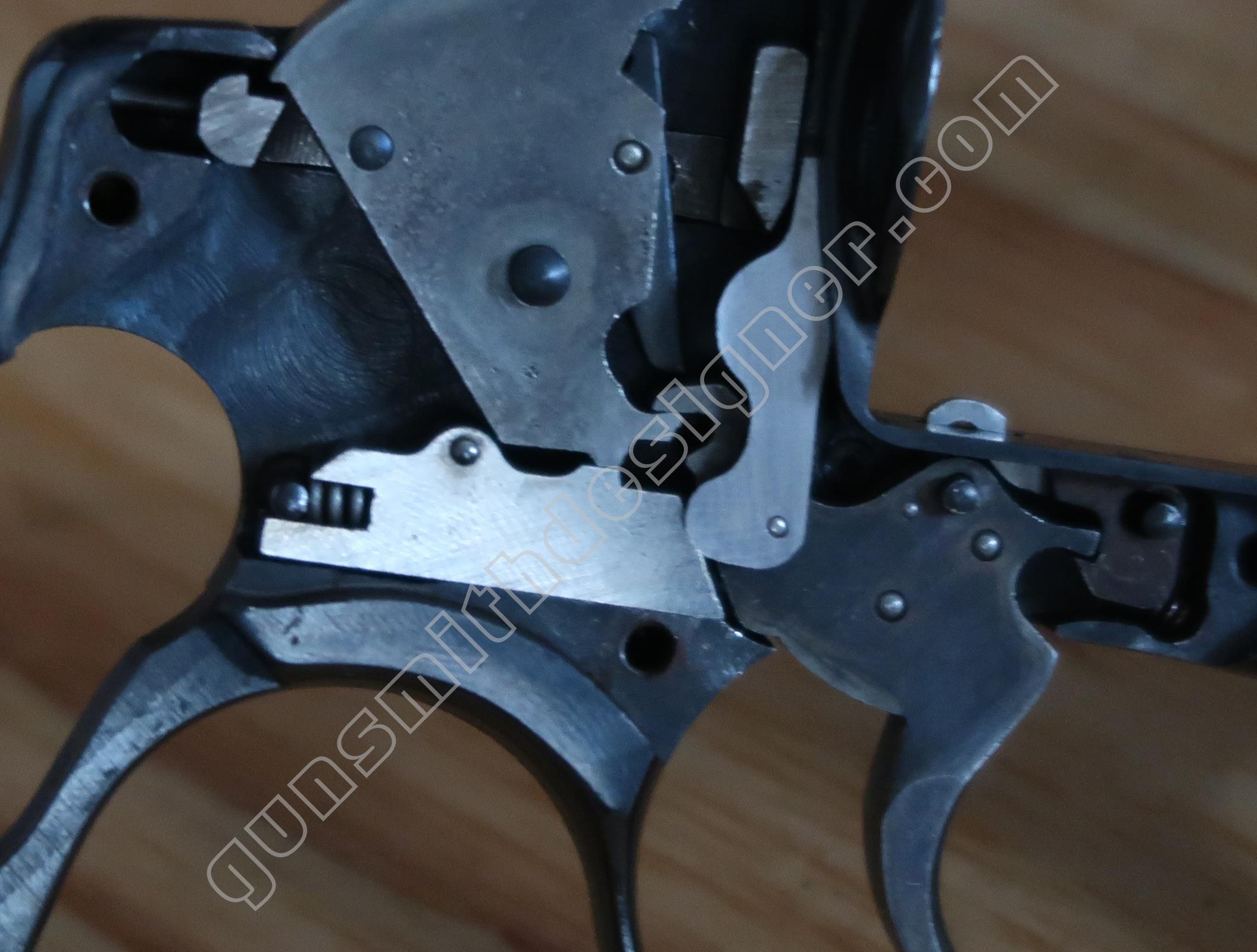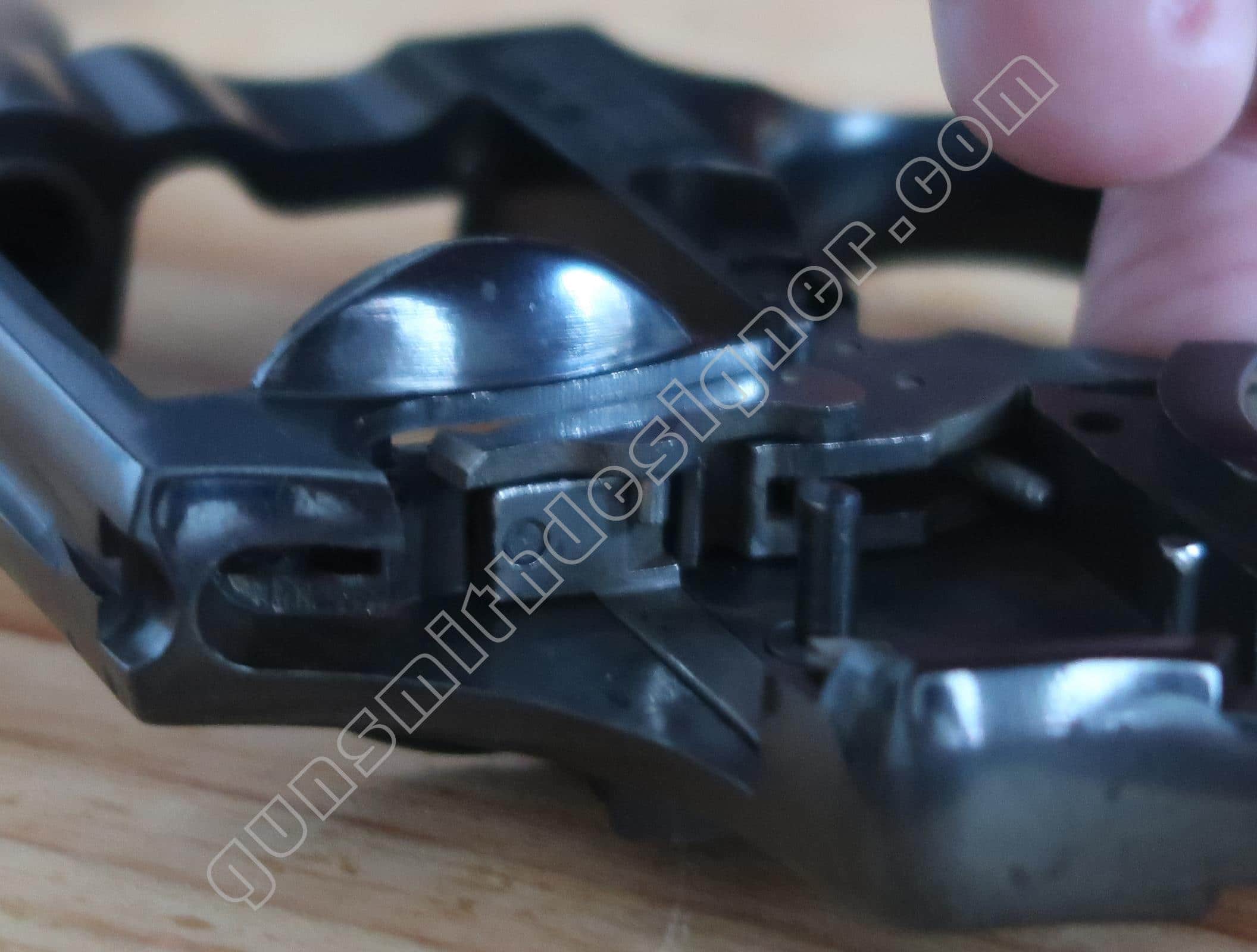 Contrairement à d’autres modèles de la marque, il n’y a pas de bielle qui le relie au ressort de chien. Ici, un axe monté sur le bas du chien retient la tige guide du ressort de chien sur ce dernier.