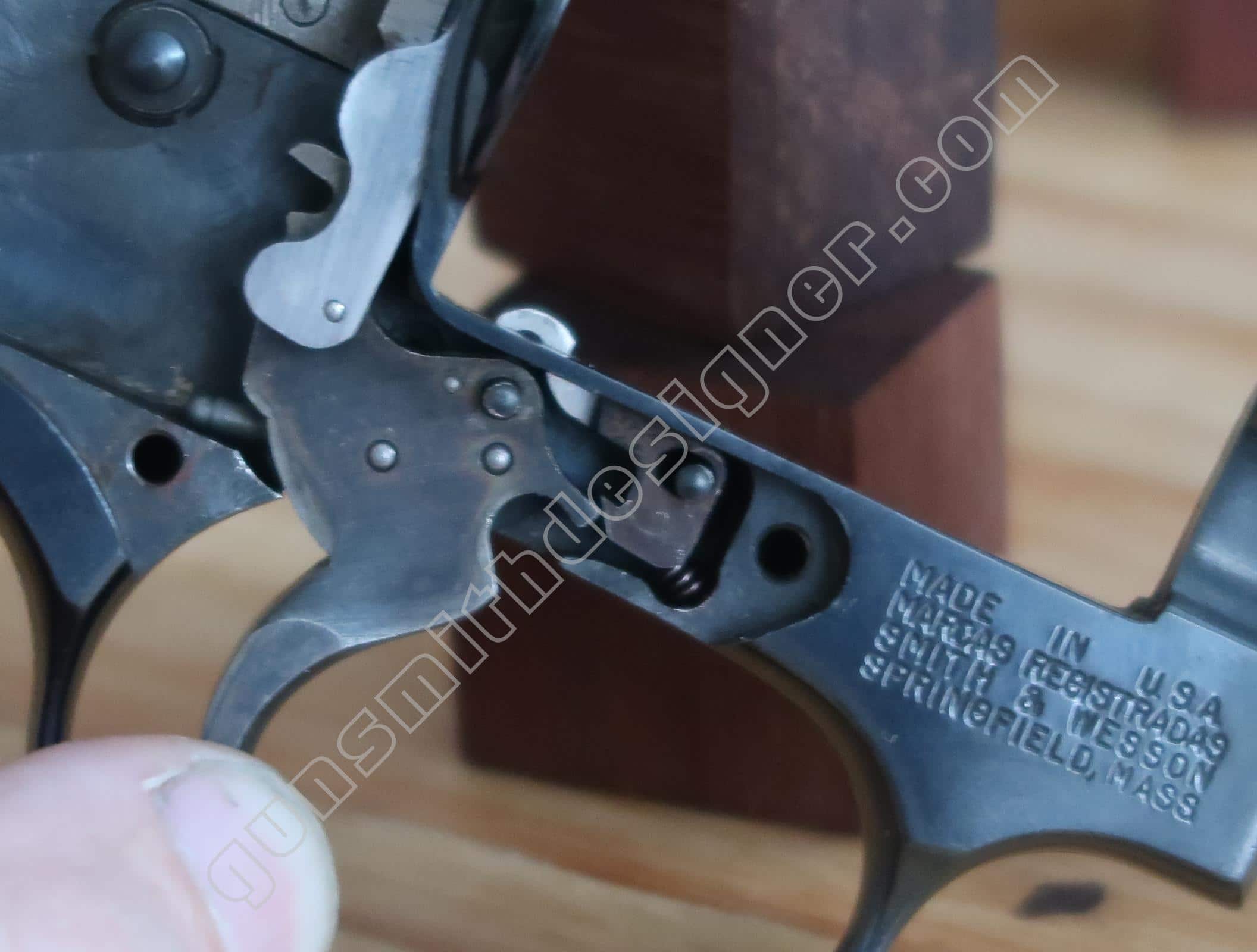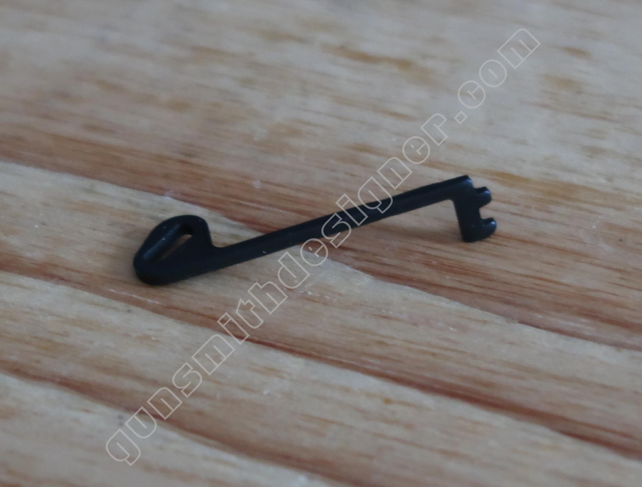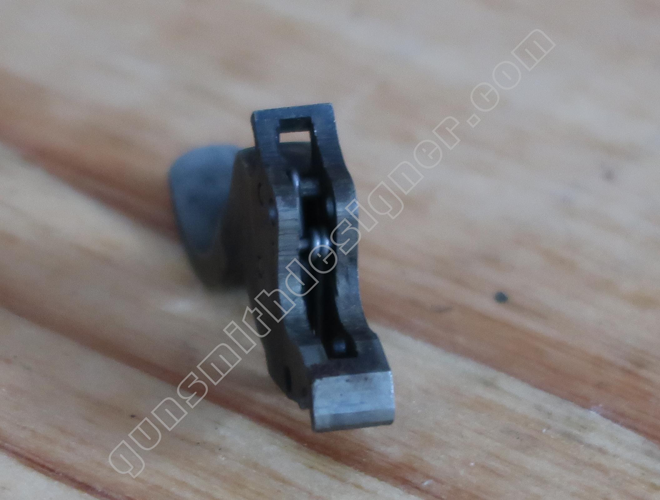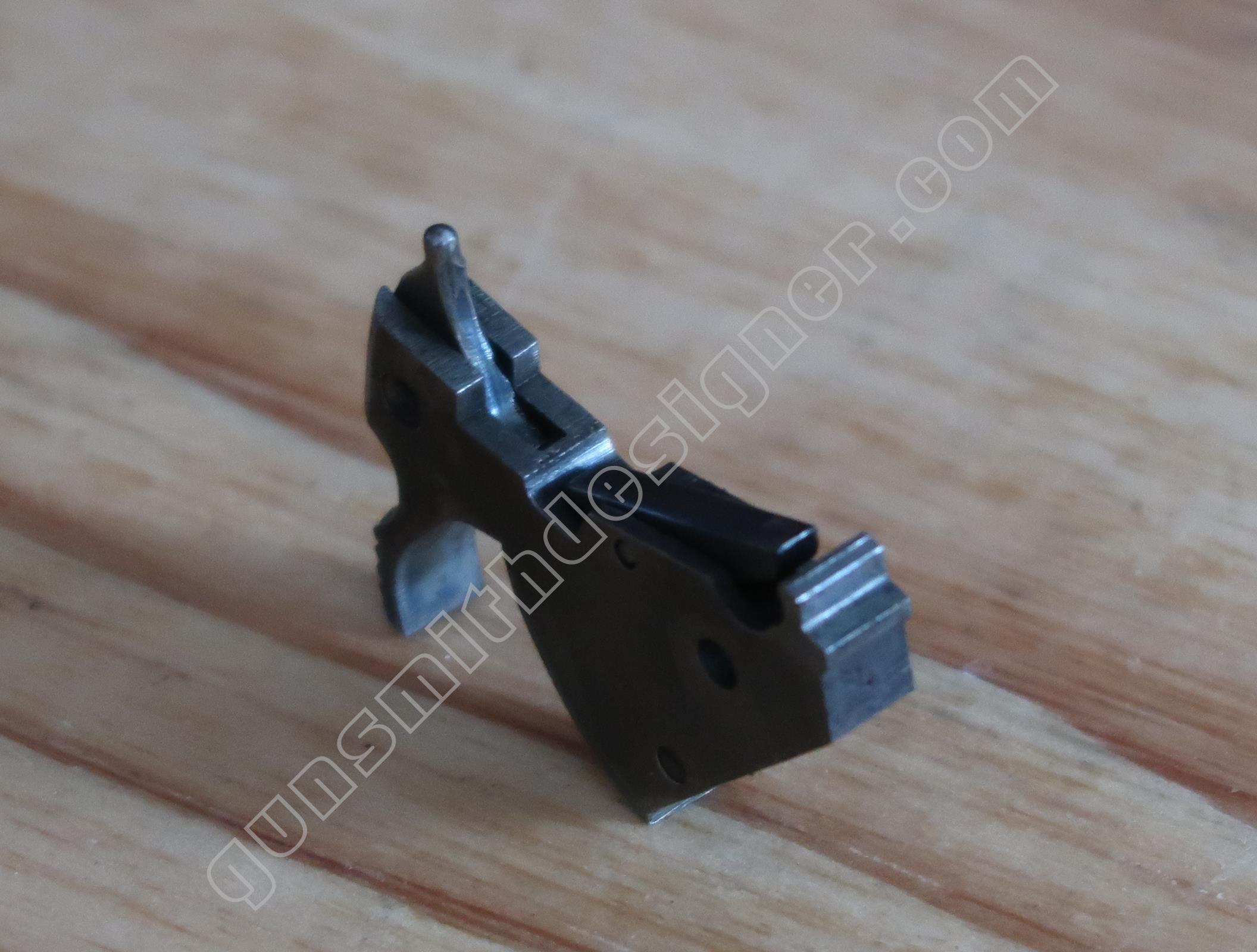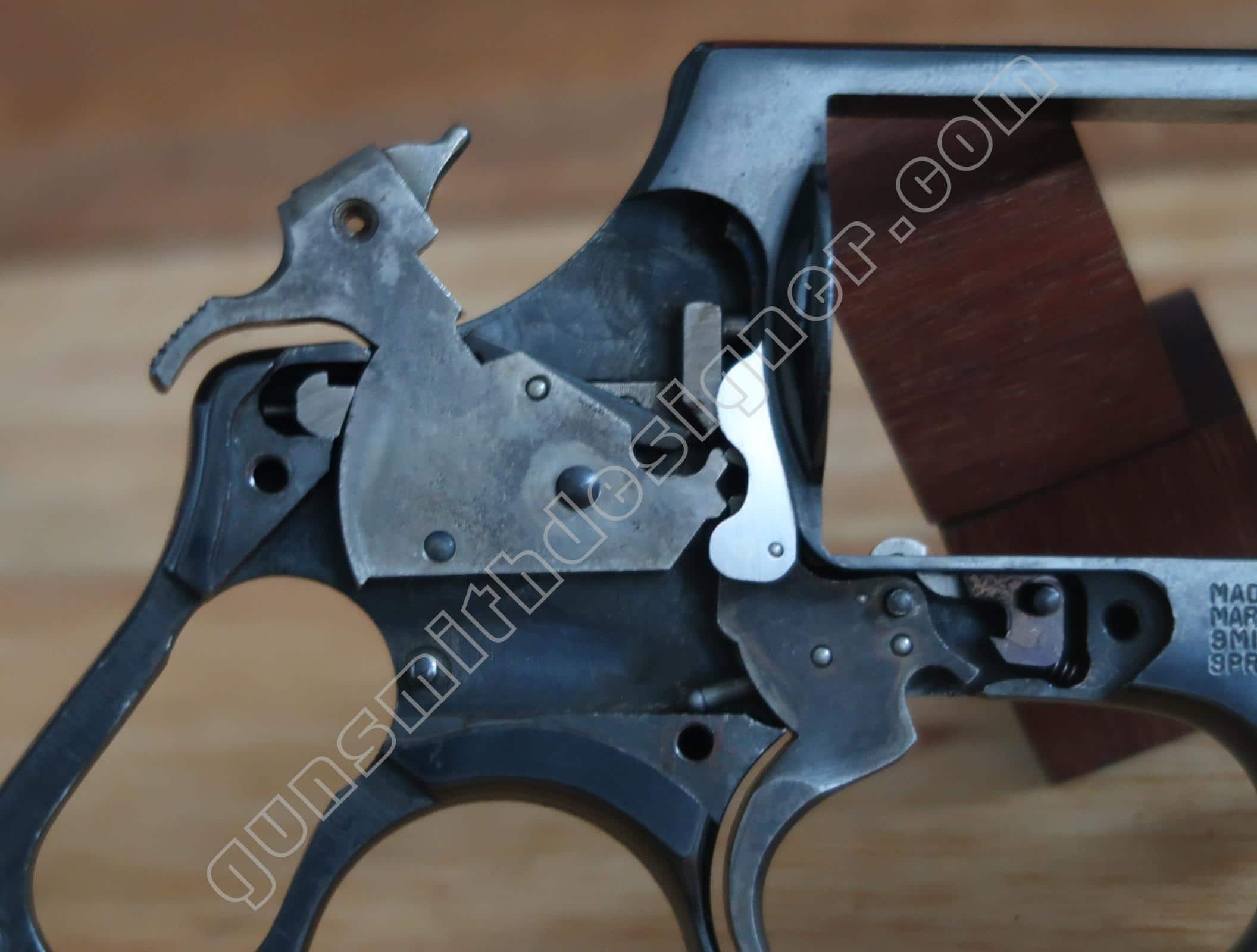 Contrairement à d’autres modèles de la marque, il n’y a pas de bielle qui le relie au ressort de chien. Ici, un axe monté sur le bas du chien retient la tige guide du ressort de chien sur ce dernier.
