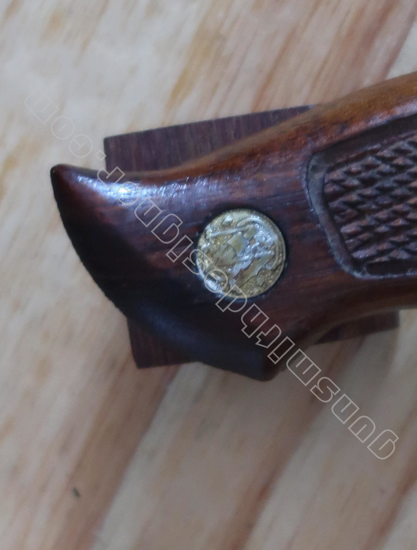 Cette arme est équipée de deux plaquettes en bois. Elles sont représentatives du type de plaquettes que l’on trouve sur les revolvers Smith et Wesson d’une certaine époque.