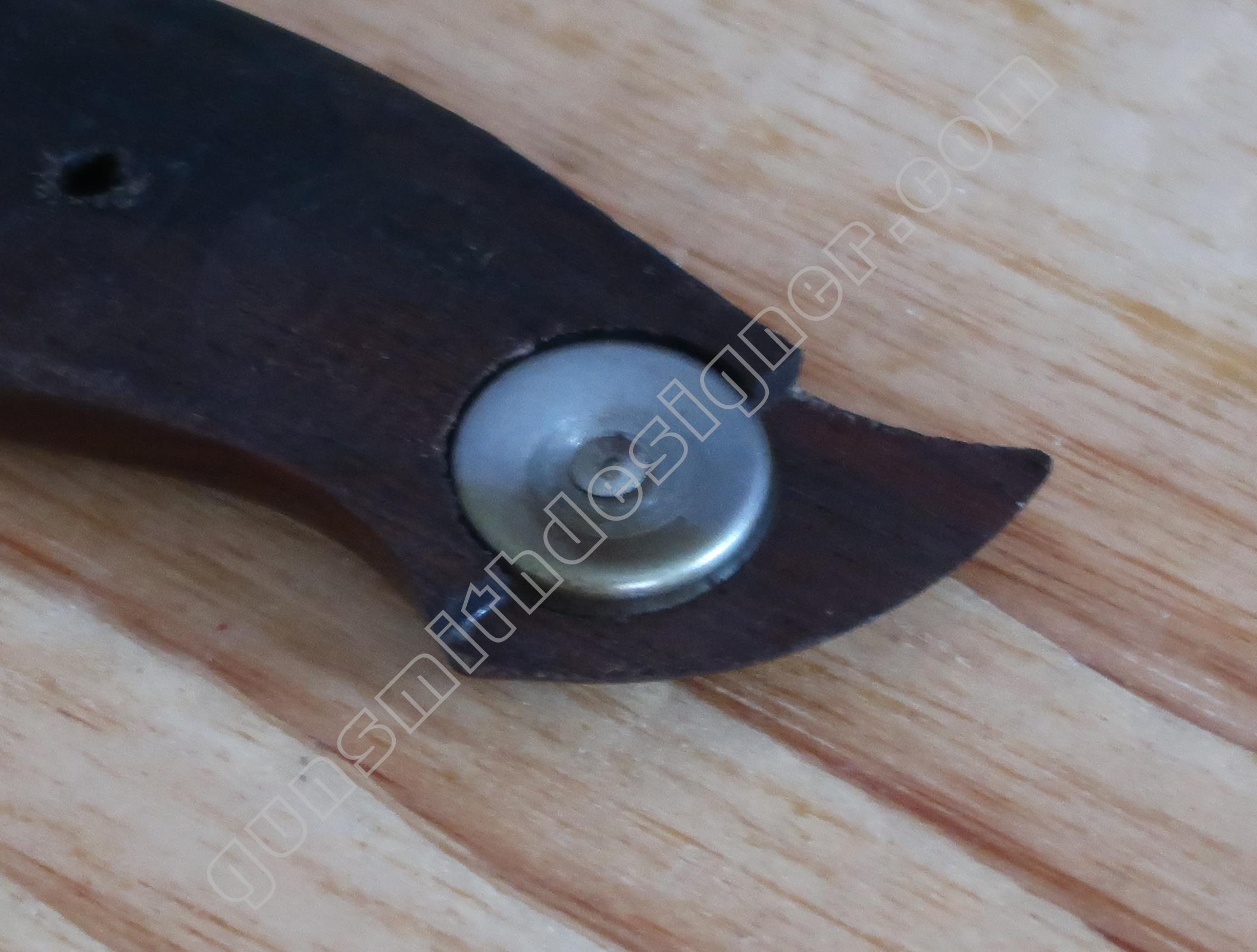Les vis de plaque de recouvrement sont en acier. La vis arrière est différente des deux autres. Les têtes de vis visibles sont bombées alors que la tête de la vis cachée par la plaquette de crosse droite est plate.