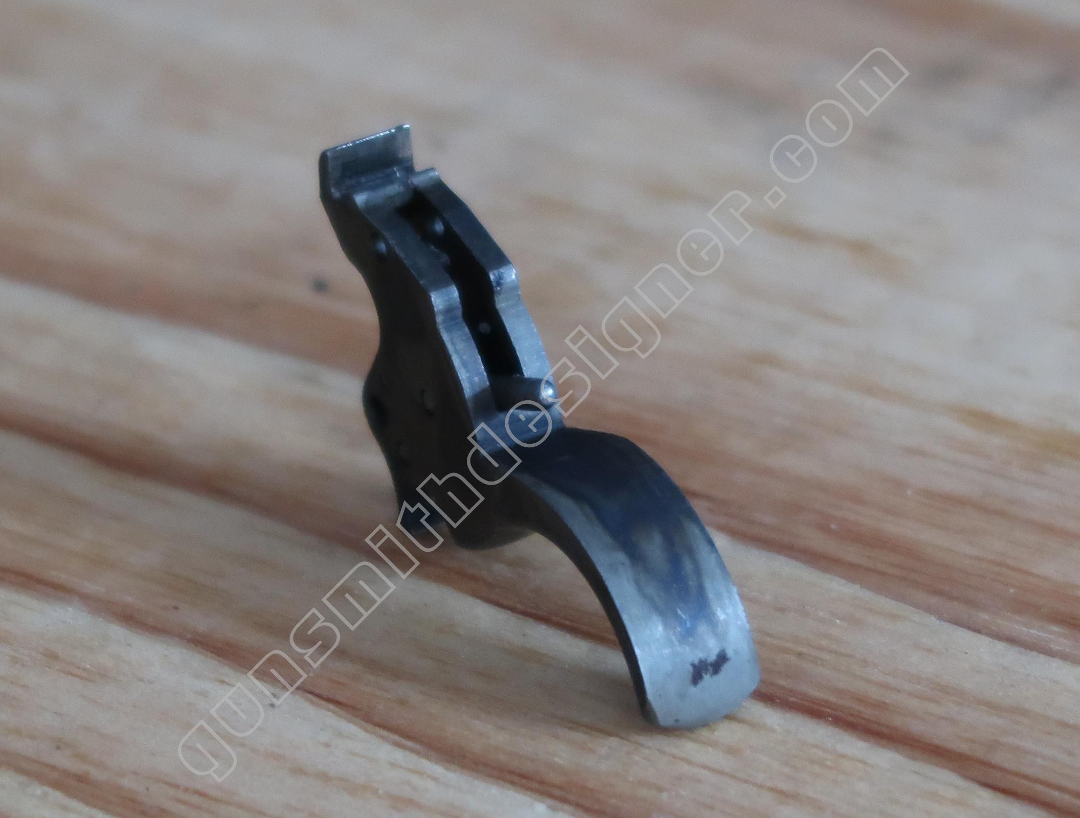 La queue de détente est en acier. Un logement est creusé en son centre, il est l’emplacement du ressort de doigt élévateur et de la bielle qui le relie au ressort de queue de détente.