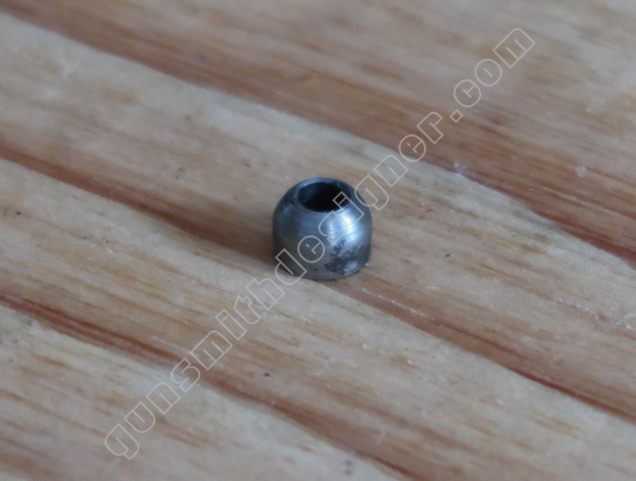 La butée du ressort de chien est en acier. Elle est obtenue dans un cylindre de : 7,6 mm de diamètre. Sa hauteur est : 5,4 mm. Un trou est aménagé en son centre, il est le passage de la tige guide du ressort de chien.
